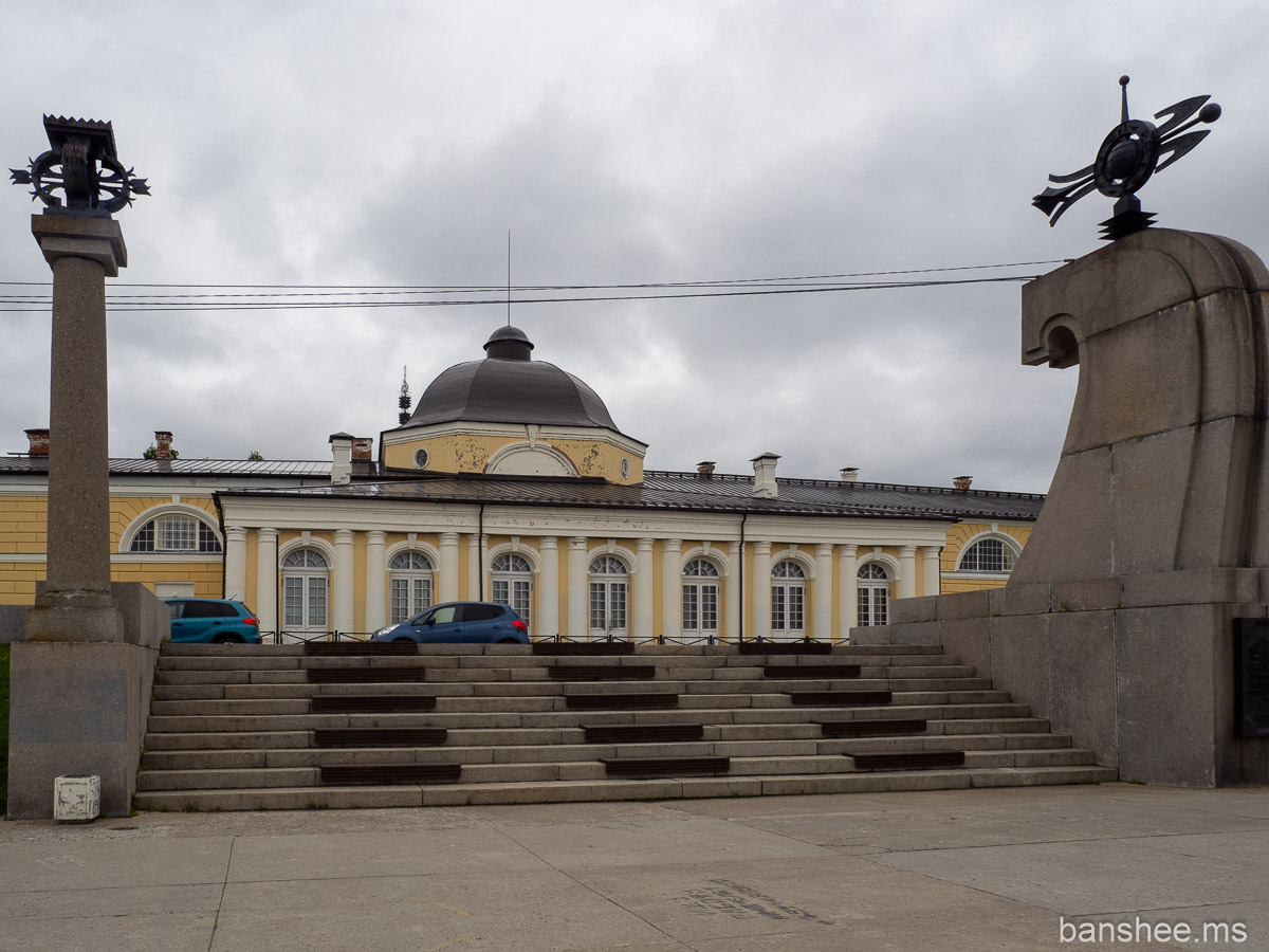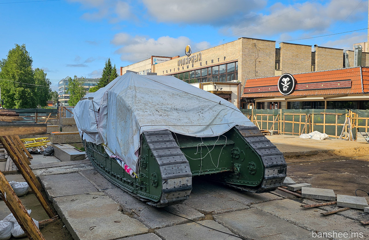 Трофейный британский танк Mark V, установлен как символ победы Красной Армии над интервентами в годы Гражданской войны на севере. В прошлый мой визит он был под стеклом, сейчас же просто прикрыт тряпочкой и окружен забором — вокруг какое-то облагораживание территории.