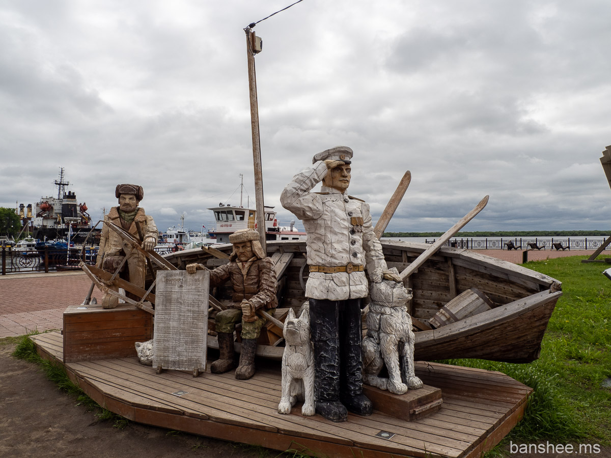 На набережной вообще много разных «малых скульптурных форм». Арт-объект «Экспедиция полярника Седова». Раньше тут стояла шхуна «Запад», принимавшая участие в съёмках фильма «Георгий Седов», но она сгорела в середине десятых.