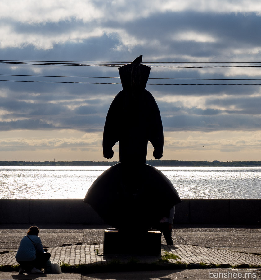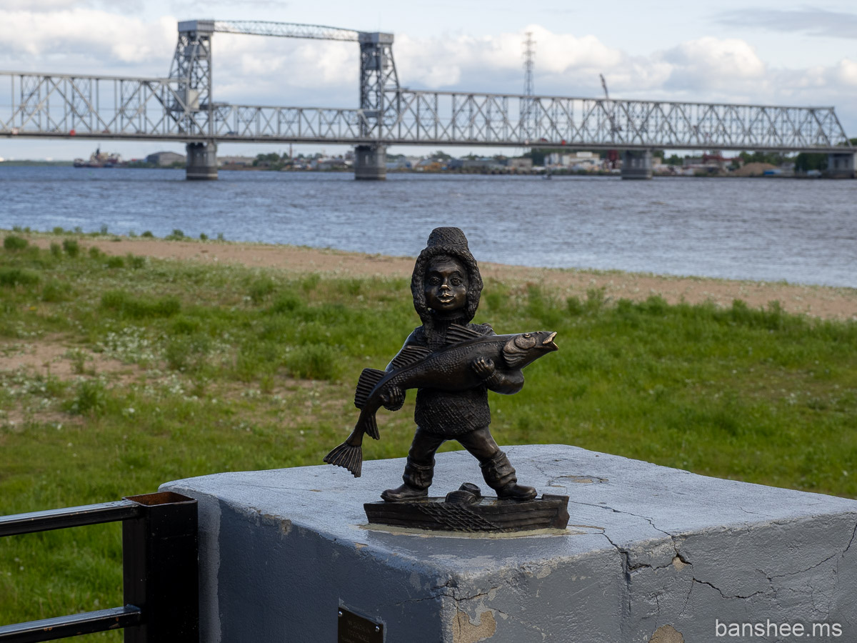 По набережной стоят фигурки из серии «Кудесники — хранители Севера». Этот — «трескоед». На заднем плане виден разводной совмещённый (авто/ЖД) мост через Северную Двину.