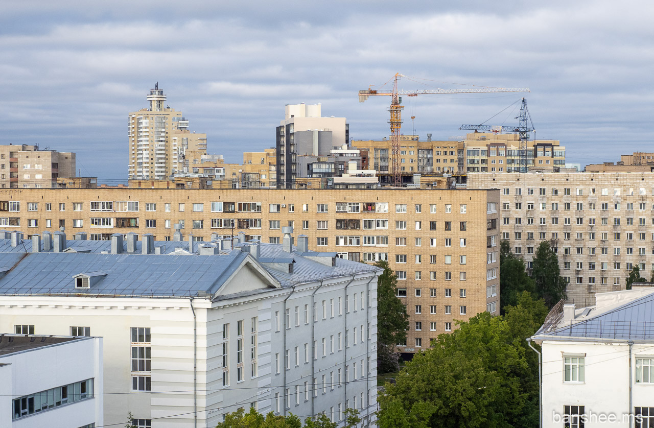 Панорама Архангельска. Где-то сталинки, где-то советские многоэтажки, где-то идёт строительство. Город строится, хотя численность населения всё равно снижается.