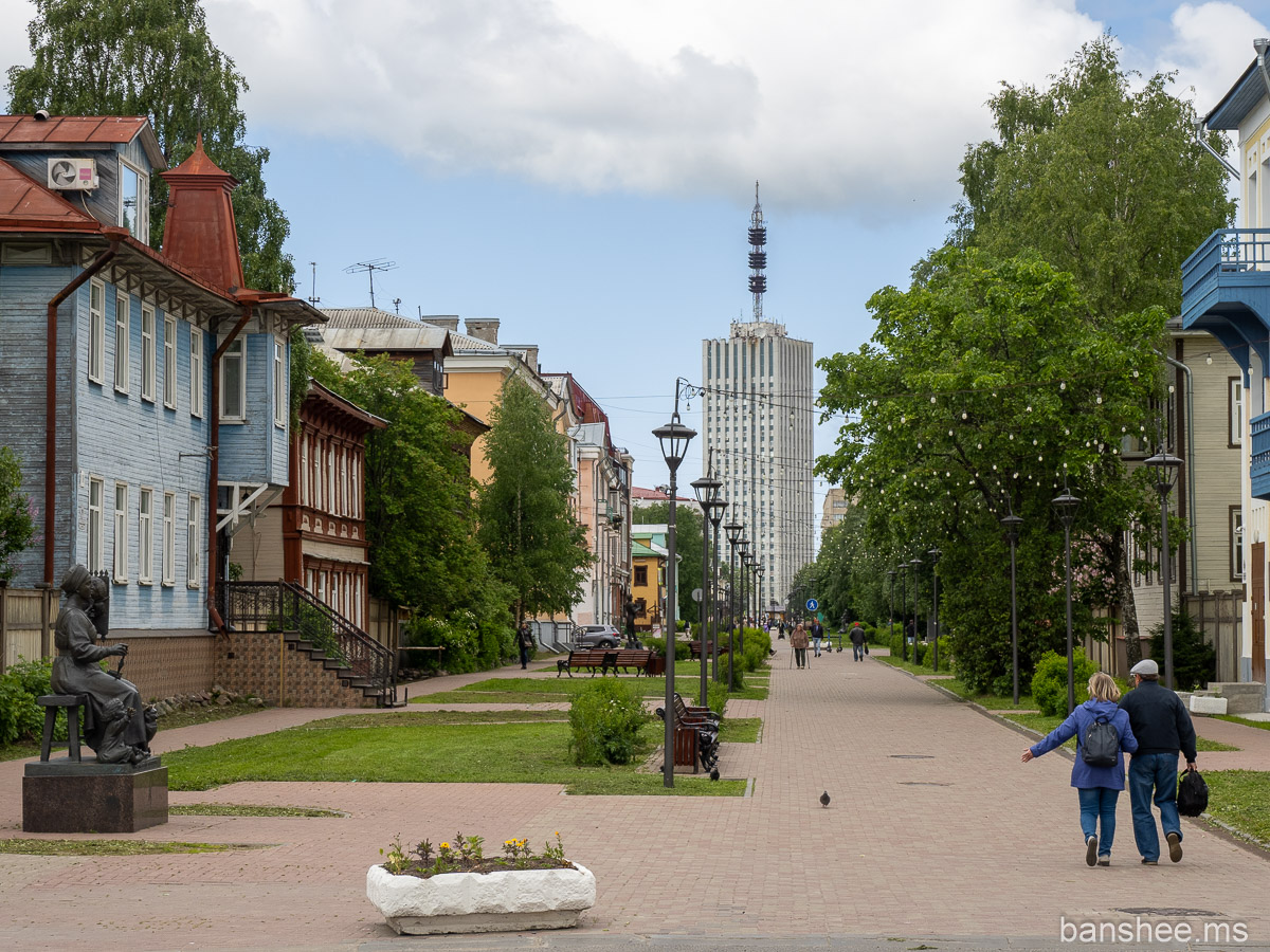 На Архангельск у меня не было конкретных планов, кроме как покататься на самом старом в России пароходе. Так что по городу я ходил бесцельно и не очень далеко. Прошелся по набережной да немножко по «центральным» улицам. Так что связного рассказа не будет, только разрозненные картинки из прогулок.